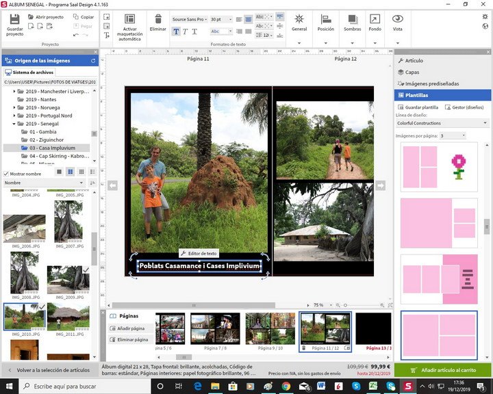 A partir de este momento, el programa no puede ser de lo más intuitivo. Se trata de ir subiendo las fotografías que uno desee en cada una de las páginas. Además, se puede cambiar la plantilla de cada una de las ellas o se puede componen una plantilla distinta para cada una de las páginas. Y, como no podría ser de otra forma, se pueden añadir todo tipo de textos. Aquí ya cada uno tiene su estilo, que ya os digo que el nuestro suele ser de lo más sobrio, con solo entre 1 y 4 fotografías por página y siempre con el fondo negro.