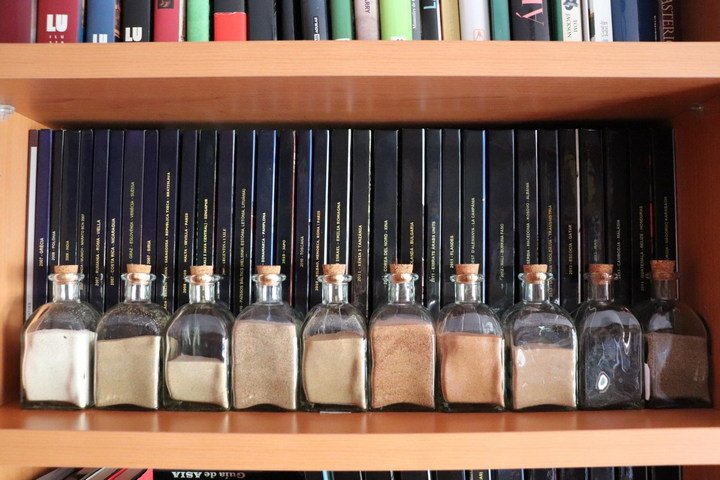 Una pequeña parte de los álbumes que hemos ido realizando los podéis ver en esta foto, en la estantería de nuestro despacho, por detrás de la colección de arenas de los distintos desertos que hemos visado.