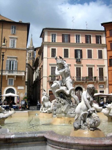 Las fuentes que encontramos son tres: la Fuente de los cuatro ríos, situada justo en medio de la plaza y que es obra del más grande de los escultores barrocos, Gianlorenzo Bernini. Es una obra de arte mayúscula, que representa los cuatro grandes ríos conocidos en aquella época: el Nilo, el Ganges, el Río de la Plata y el Danubio, y que está coronada por un obelisco de 17,6 metros de altura, que fue mandado cortar de las canteras de Asuán por el emperador Domiciano, entre el 86 y el 91. el obelisco tuvo varios emplazamientos, entre ellos, el Circo Máximo, pero en la época del barroco se restaura y se sitúa en la plaza Navona.