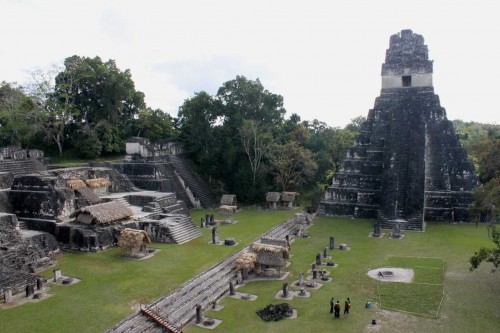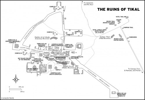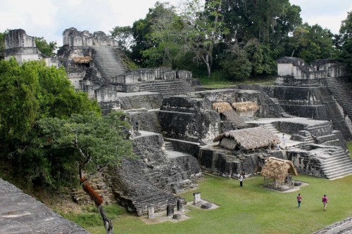 Al llegar en bus a Tikal y tras pasar la puerta de acceso (y pagar), recorrimos un sendero por donde vimos fugarse una aguti (un roedor propio de América Central que mide poco más de medio metro). El sendero nos llevó en poco menos de media hora directamente a la Gran Plaza, tras pasar por varias estructuras menores. De camino encontramos también una familia de más de veinte coatís que salieron a nuestro paso. Como su nombre indica, la Gran Plaza es la más majestuosa de toda la ciudad y en cierto modo es su centro gravitacional. A este y oeste hay dos grandes pirámides, llamadas Templo del Jaguar (o Templo I) y Templo de las Máscaras (o Templo II). Al norte de la Gran Plaza, queda la Acrópolis Norte, que contiene gran cantidad de estructuras. Al sur de la Gran Plaza, queda la Acrópolis Sur.