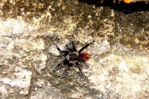 En el Mundo Perdido encontramos una pirámide no tan esbelta como las que hemos encontrado hasta ahora y que estaba decorada con máscaras de estuco. Fecha del Preclásico tardío y es una pirámide de base cuadrada, de unos treinta metros de altura y con escaleras en sus cuatro lados. Parece ser que en su cima había algún templo que habría desaparecido. Aquí encontramos una enorme y peluda araña tarántula, que un guardia cogió para enseñárnosla. Aunque insistía en que no picaba, decidimos no hacerle caso.