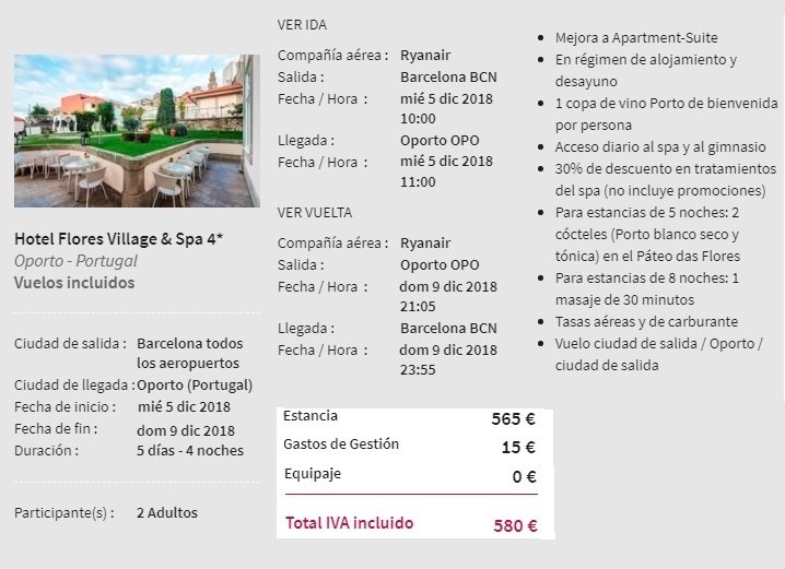 Para el hotel, la misma página nos ofreció varias posibilidades, de precios distintos. Siempre se trataba de alojamiento de muy buena categoría y bien situado. Escogimos en hotel Flores Village&Spa, que se sitúa en el mismo centro de Oporto. Al llegar a Oporto pudimos comprobar que habíamos acertado con el hotel. El precio total fue de 580€ para 2 personas. Excelente si consideramos que viajamos en temporada alta, en pleno puente de la Constitución.