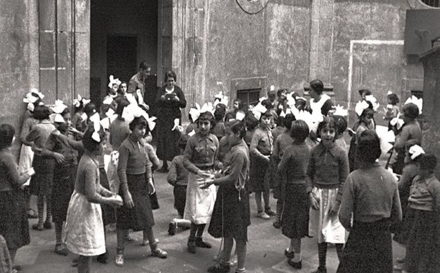 A principios de año, Barcelona no estaba situada en primer linea del fuego y era una ciudad receptora de muchos refugiados republicanos procedentes de regiones ocupadas por las tropas franquistas. Sin embargo, no era Barcelona una ciudad especialmente segura para el estamento religioso, hasta el punto de que, como otras iglesias, Sant Felip Neri fue abandonado por los curas y pasó a manos de la Generalitat de Cataluña. Durante aquel periodo, el convento fue habilitado como centro de acogida para niños refugiados de territorios ocupados por las tropas nacionales. A menudo, niños cuyas madres no podían hacerse cargo de la cura de sus hijos y cuyos padres seguían luchando en el frente. Muchos de ellos, procedían de Alcalá de Henares. La foto siguiente, de Josep Brangulí (Arxiu Nacional de Catalunya) nos remite a aquellos tiempos.