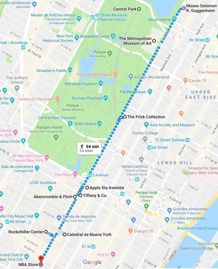 Todo el trayecto que hemos hecho hasta el momento ha ido paralelo al Central Park, el más famoso de los parques neoyorkinos y, quizá, del mundo entero. Se trata de otro lugar donde el visitante puede pasar un día entero, paseando entre senderos arbolados y disfrutando de sus lagos, puentes y praderas. Un lugar ideal para hacer deporte o, simplemente, dejar pasar las horas.