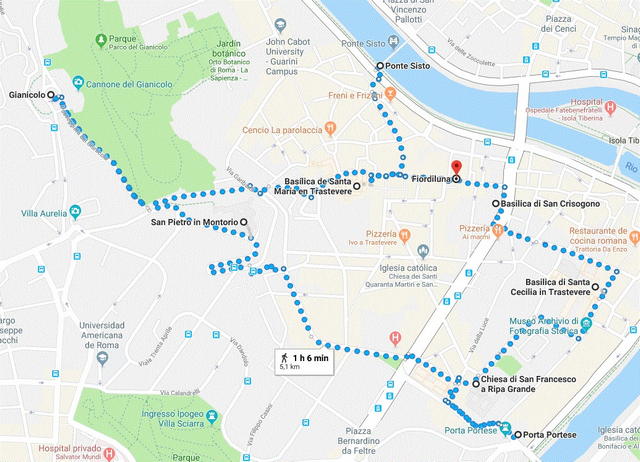 Os voy a recomendar una ruta por Trastevere de unos 5 kilómetros en total, que pasa por varios de los lugares imprescindibles de Trastevere. Entraremos por el Puente Sisto que cruza el Río Tíber y terminaremos en la Colina del Gianicolo, donde podréis disfrutar de unas maravillosas vistas aéreas de toda la ciudad de Roma.