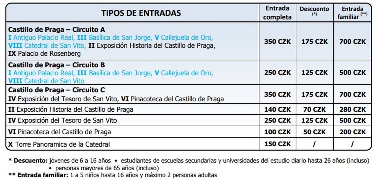 Os dejo esta tabla con los precios de las entradas al Castillo de Praga.