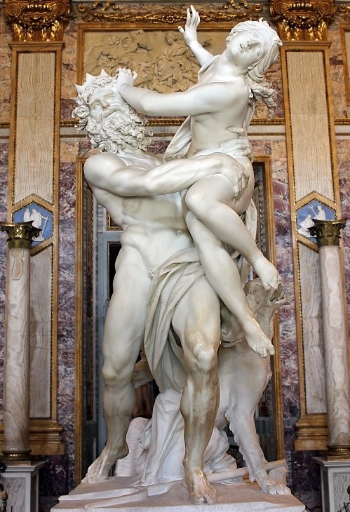 Sin embargo, mi obra favorita es el Rapto de Proserpina que se puede visitar en la Galería Borghese de la capital italiana. Esta obra, muestra el momento en que Proserpina es raptada por Plutón, soberano de los infiernos. Los dedos de Plutón, hundiéndose en el muslo de Proserpina, tratando de inmovilizarla, suponen uno de los momentos sublimes de la Historia del Arte.