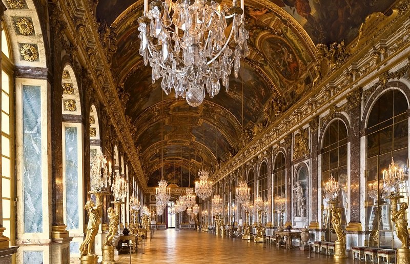 Dorados por doquier, bóvedas pintadas al fresco ensalzando la monarquía borbónica, grandes espejos con marcos también dorados, pesadas y ornamentadas lámparas pendiendo de los techos del palacio y todo tipo de detalles decorativos convierten el Palacio de Versalles en uno de los ejemplos más destacados del arte barroco mundial.
