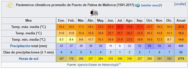 Os dejo con la tabla de clima y temperatura de Mallorca, tomada de la wikipedia.