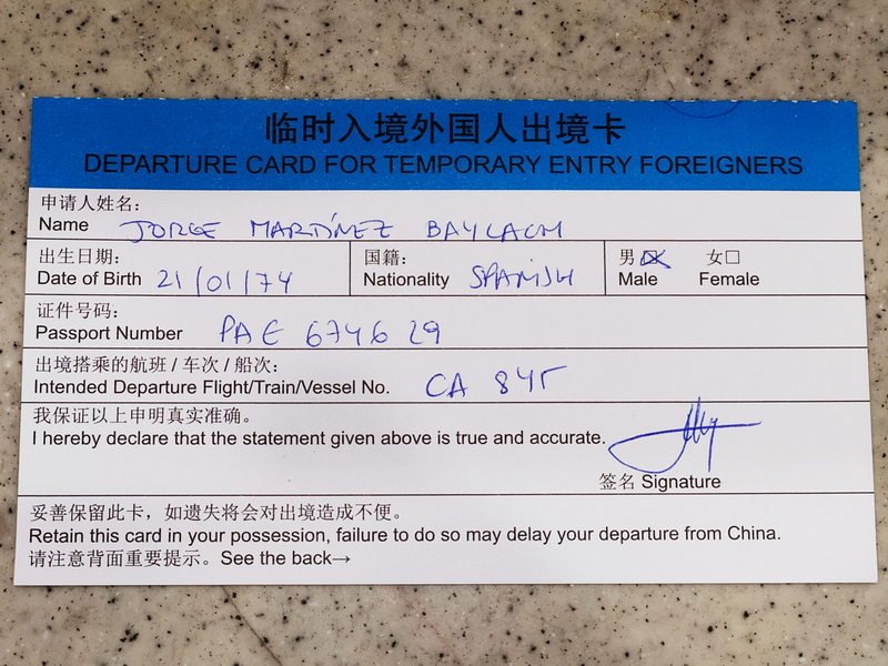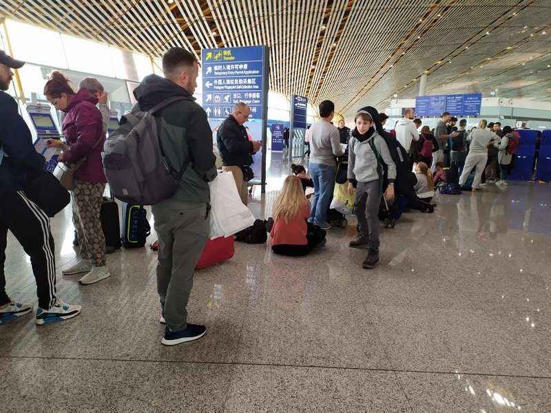 Estuvimos hora y media en esta cola y teníamos, solamente, unas 50 personas por delante. Debéis rellenar una TARJETA BLANCA DE INMIGRACIÓN. Ojo: no la tarjeta amarilla que es la habitual, si no la blanca, que es la que se necesita para el programa de tránsito en China sin visado.