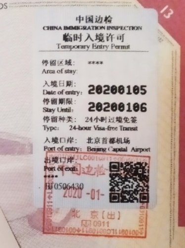 Cuando os toque vuestro turno y si sois elegibles, os podrán un sello en vuestro pasaporte (en realidad una pegatina), con la fecha de entrada, la fecha máxima de salida (144 horas para Pekín) y los lugares a los que podéis acceder (en caso de entrada por Pekín podréis visitar Pekín, Tianjin y la provincia de Hebei).